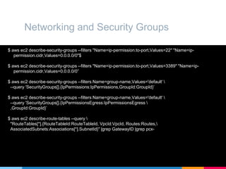 Aws ec2 describe-security-groups --query SecurityGroupsVpcIdVpcIdSecurityGroupNameGroupNameIngressRuleIpPermissionsEgressRulesIpPermissionsEgress aws elb describe-load-balancers --load-balancer-name --query LoadBalancerDescriptionsActivePolicyListenerDescriptions --output table. This was a tricky one but the answer is buried in the documentation. Run the following command in the AWS CLI to find network interfaces associated with a security group based on the security group ID.